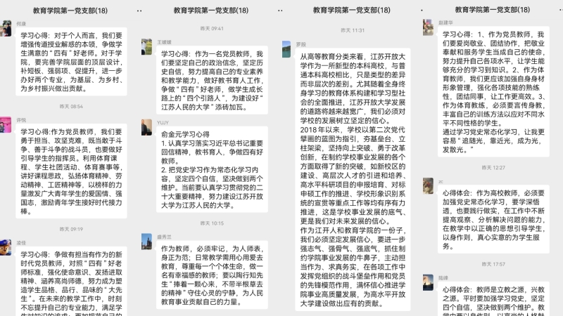 在线下集中学习的同时,第一党支部全体党员还通过自学+线上交流的方式学习了《省委教育工作领导小组秘书组 省委教育工委关于全省教育系统深入学习贯彻习近平总书记给北京师范大学“优师计划”师范生重要回信精神的通知》《省委教育工委印发关于推动党史学习教育常态化长效化实施意见的通知》《党委书记王建明在2022年下半年党支部书记座谈会上的讲话》三个文件。每位党员认真学习、深刻领会,并将自己的心得体会分享在了支部群中,进一步激发了各位党员不忘初心、砥砺前行的信心。