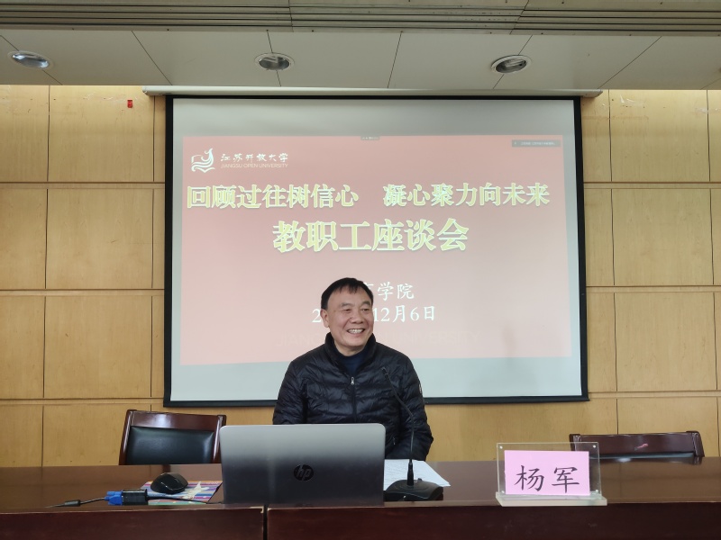 杨军老师以《强教必先强师,为建设高水平开放大学而努力奋斗》为题,从回顾过往、强师必先奋斗、不忘初心教书育人三方面展开座谈。杨军老师对学院老师深情寄语,一是不断提升教学质量,大胆探索,敢破敢立,逐步形成个人教学风格,二是用心设计课堂,适应当今教育改革的新形势,三是终身学习,使教学内容紧跟学科发展步伐。