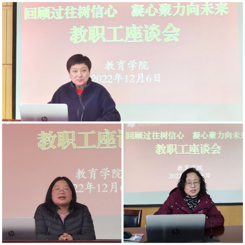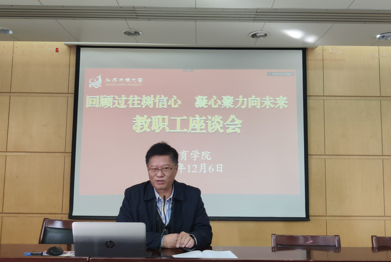 结合江苏开放大学办学十周年成就回顾与总结,12月6日,教育学院分工会在定淮门校区图书馆楼2-2阶梯教室举办了以“回顾过往树信心 凝心聚力向未来”为主题的教职工座谈会。校党委常委、纪委书记顾新华,教育学院全体教职工参加了座谈。会议由学院党总支书记罗殷主持。