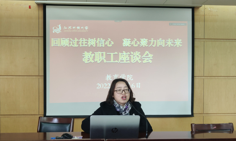 会议伊始,罗殷指出,2022年是一个非常关键的年份,对于伟大的中国共产党、对于江苏开放大学而言,都是意义非凡的一年。党的二十大是在全党全国各族人民迈上全面建设社会主义现代化国家新征程、向第二个百年奋斗目标进军的关键时刻召开的一次十分重要的大会。今年是学校从江苏广播电视大学更名为江苏开放大学的第十年,也是学校第二次党代会战略规划第一步目标任务的冲刺收官之年。她向与会教师介绍了学校十年间事业发展的成就,并指出,只有认真回顾走过的路,不忘来时的路,才能继续走好前行的路。