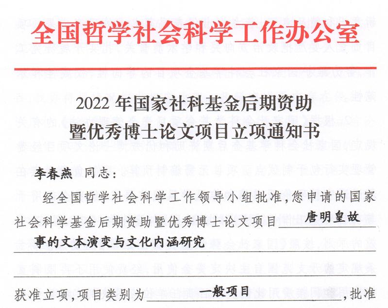 近日,全国哲学社会科学工作办公室下发了2022年国家社科基金后期资助项目立项通知书,我校教育学院李春燕博士申报的“唐明皇故事的文本演变与文化内涵研究”获批立项,这是教育学院首次获得国家级社科基金项目,极大地鼓舞了全院教师开展科研工作的热情和信心。
