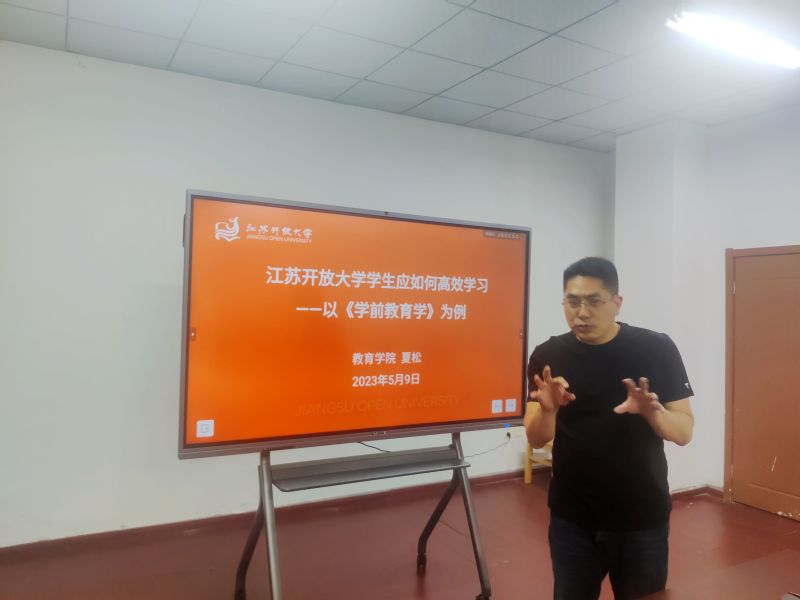 本次线下教学由学前教育系主任夏松副教授主讲,共有开放学员近40人来到线下学习。夏松根据开放学员们的学习需求及自身的教学实践,从为何要继续学习这个问题出发,阐明了终身学习的必要性以及开放教育的便捷性;从为何选择某个专业学习这个问题出发,概括性地介绍了江苏开放大学开放教育的专业设置以及婴幼儿托育服务与管理专业的发展情况及专业优势;随后,重点分享了如何高效完成课程学习的方法,并提出了学习的相关要求。