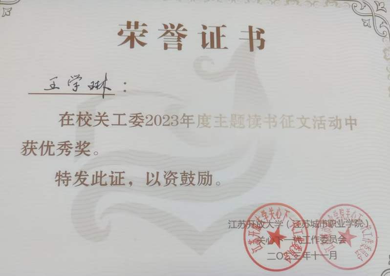 近日,在学校组织的2023年主题教育读书征文活动中,我院直属开放学生王学琳的征文作品《第一道防线》获优秀征文。据了解,在本次活动中,王学琳是唯一一位获奖的开放学员。