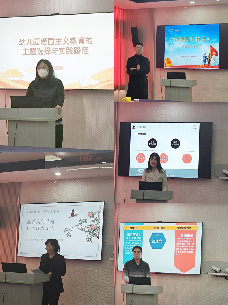 李春燕老师以《诗经▪蓼莪》为例讲述了大学语文课程的思政整体设计。吕会颖老师从教材、学情、教学方法、教学设计和教学特色五方面介绍了管理学原理与实务课程的思政整体设计。黄小宇老师从粮食安全问题中挖掘出学生的粮食安全意识和忧患意识,引导学生学习袁隆平院士的爱国精神并在现实生活中切实做到珍惜粮食、杜绝浪费。李夏老师通过高铁引入导数,让学生体会中国速度以及基建大国的实力,激发学生的民族自豪感和使命感。赵博颉老师从幼儿发展与健康管理专业的开放学生入手,引导该专业学生将爱国情感融入到幼儿园教育活动设计中去。