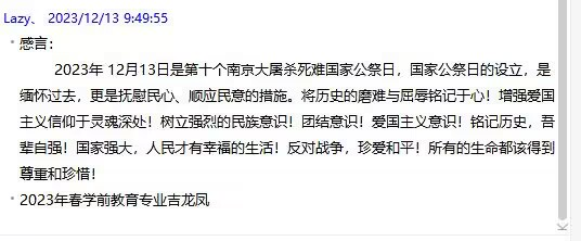 2023年12月13日是第十个南京大屠杀死难者国家公祭日,国家公祭日的设立,是缅怀过去,更是抚慰民心、顺应民意的措施。我们要将历史的磨难与屈辱铭记于心!增强爱国主义信仰于灵魂深处!树立强烈的民族意识!团结意识!爱国主义意识!铭记历史,吾辈自强!国家强大,人民才有幸福的生活!反对战争,珍爱和平!所有的生命都该得到尊重和珍惜!