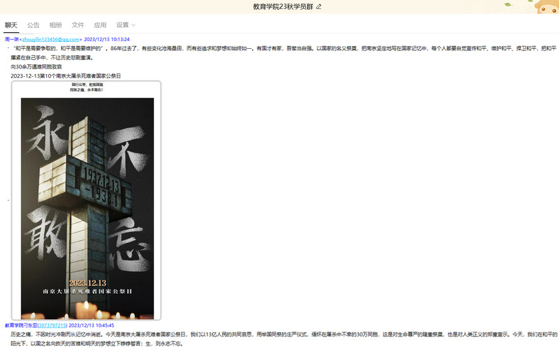 12月13日,江苏开放大学教育学院以第十个南京大屠杀死难者国家公祭日为契机,开展思想政治教育和爱国主义教育活动,旨在教育学生不忘历史,珍惜和平,同时增强他们的爱国情怀和社会责任感。活动引起了学生们的热烈讨论和深深反思。