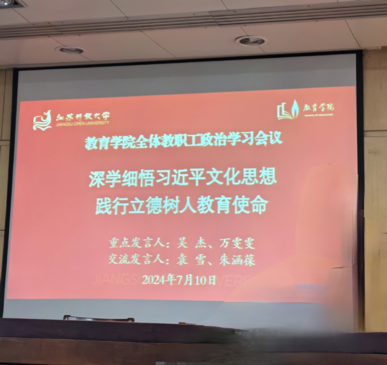 2024年7月10日下午,教育学院在定淮门校区图书馆楼2-2阶梯教室召开党总支专题学习交流研讨暨全体教职工政治学习会议。学院全体教职工参加了会议,会议由学院党总支书记罗殷主持。
