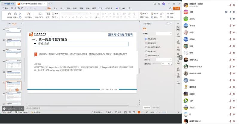 为进一步提升课程导师的专业素养和教学指导能力,提高《文献检索与论文写作》课程的线上教学质量,教育学院于3月3日晚召开了2025春季学期线上教学研讨会。会议由辛甜甜主持,课程负责人孙雷与该课程的各位导师一起参会。