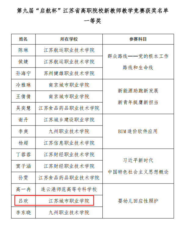 3月30日,第九届“启航杯”江苏省高职院校新教师教学竞赛决赛在南京师范大学顺利闭幕。教育学院学前教育系青年教师吕欢表现优异,荣获一等奖,展现了学院教师队伍的专业风采。