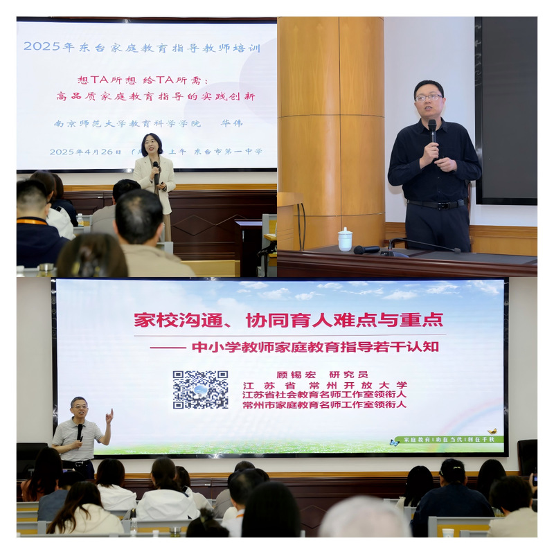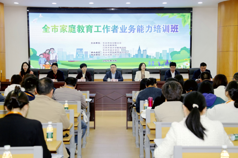 为深入贯彻落实习近平总书记关于家庭教育的重要论述,凝聚家庭教育力量,构建家校社协同育人新模式,我校教育学院积极行动,联合东台市教育局、东台市妇女联合会、东台开放大学,于4月26日在东台市第一中学成功举办了家庭教育工作者业务能力培训。我校教育学院院长吴杰,东台市妇女联合会主席夏亚萍、东台市教育局副局长韩益钧、东台市第一中学校长冯小勇、东台市妇女联合会副主席郑娴等嘉宾出席本次活动,活动由东台市开放大学党总支书记、校长储爱国主持。