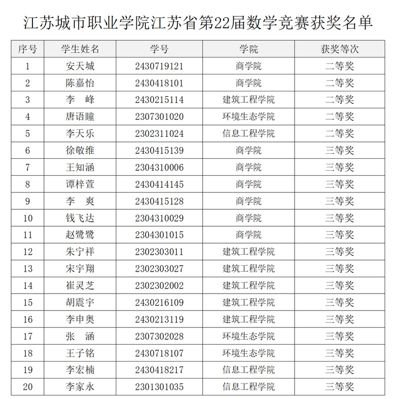 近日,江苏省高等学校第二十二届高等数学竞赛结果揭晓,江苏城市职业学院学子在专科组竞赛中表现优异,共斩获二等奖5项、三等奖15项。