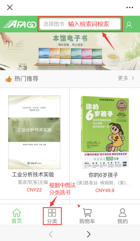 2、输入检索词检索图书,或根据左侧图书分类选书,也可点击新书专区、热门推荐、纸电同步模块中选书。