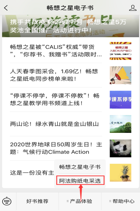 方法2、微信关注“畅想之星电子书”公众号,下拉菜单——产品体验——阿法购纸电采选,即可根据读者需求选书。