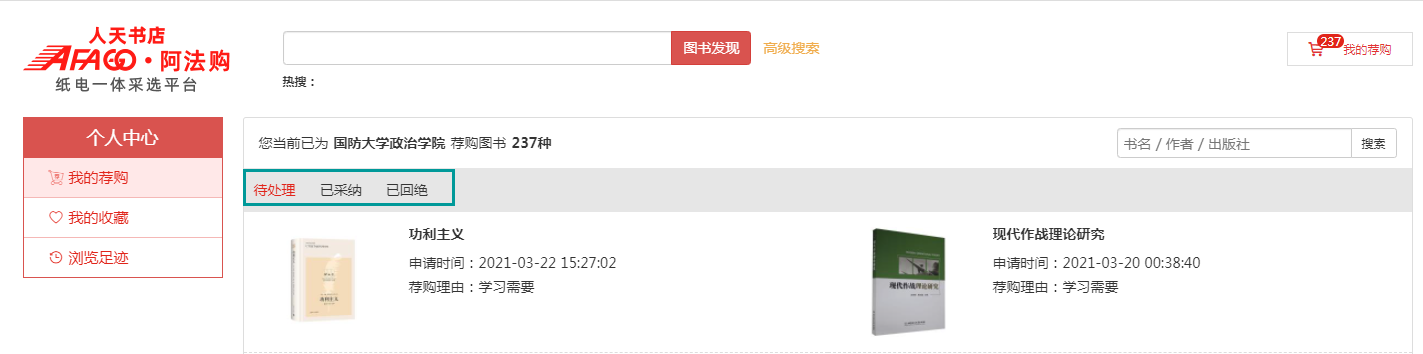 4、我的荐购:【个人中心】→【我的荐购】 中可查看到所有的荐购书目,及图书馆的采纳情况。