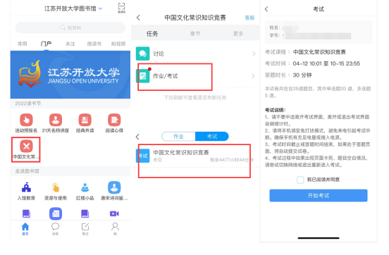 首页点击【中国文化常识知识竞赛】应用,加入课程后选择考试,阅读考试说明并开始点击开始竞赛。