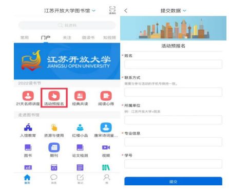 进入江苏开放大学图书馆首页后,点击【活动预报名】,按照要求填写相信息。