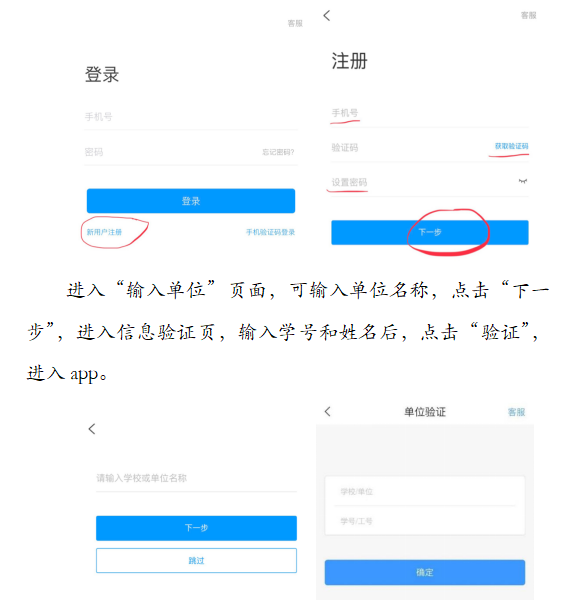 2、进入“输入单位”页面,可输入单位名称,点击“下一步”,进入信息验证页,输入学号和姓名后,点击“验证”,进入app。