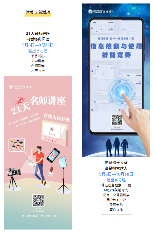 2022年读书节将于9月6日(周二)上线【21天名师讲座】和【信息检索与使用技能竞赛】两项新活动。