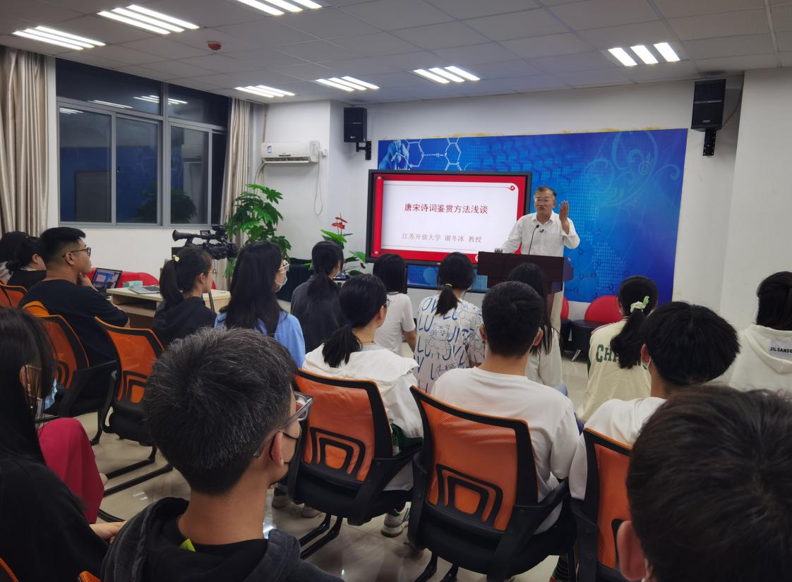 9月15日晚,一场以“唐宋诗词鉴赏方法浅谈”为主题的凤凰论坛名师讲座在应天校区图书馆1004创客空间举行,讲座由图书馆和校社科联共同举办。线上,腾讯会议室全程满座,到访人数达到840人次;线上线下共吸引了来自校本部国学社学生、大一新生代表、图书馆全体教职工及全省办学系统师生近千人次聆听讲座。