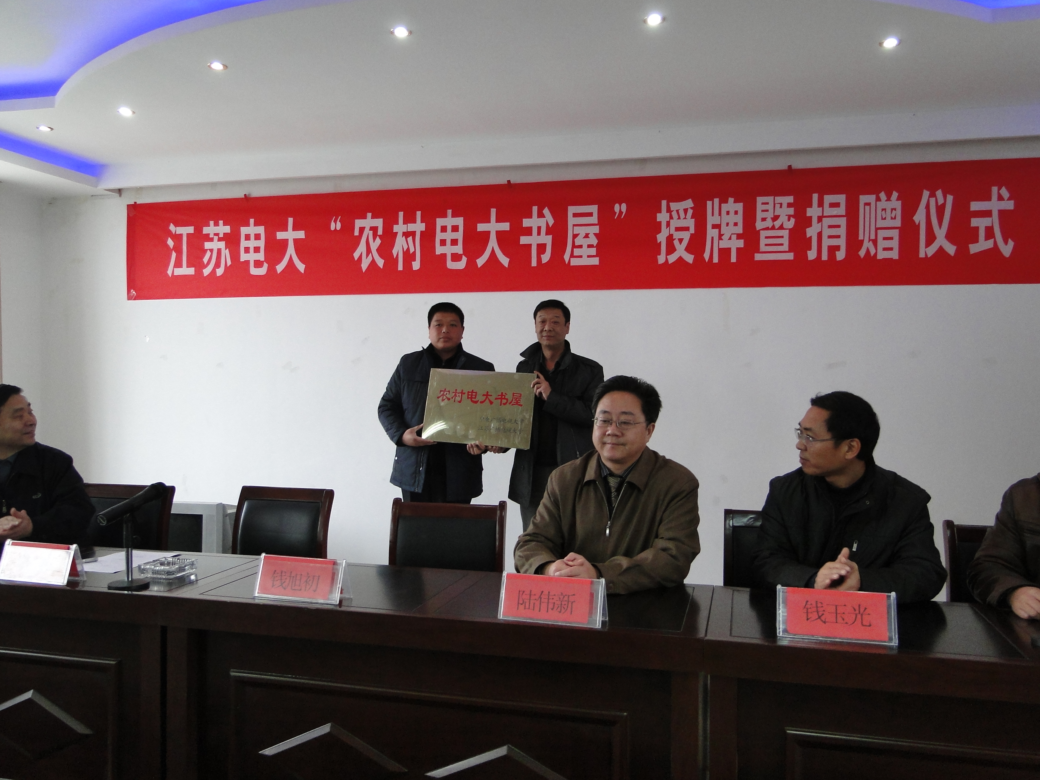 11月22日上午,图书馆在灌云县小伊乡政府会议室举行“农村电大书屋”授牌暨捐赠仪式。仪式由小伊乡任浩东副乡长主持。钱旭初馆长代表校图书馆向小伊乡徐瑞副乡长授“农村电大书屋”铭牌,资产管理处刘健青处长与小伊乡王春玉宣委签署了江苏电大向小伊乡捐赠8台电脑的协议书,财经系党总支陆伟新书记作为书屋共建部门的负责人出席了此次活动。