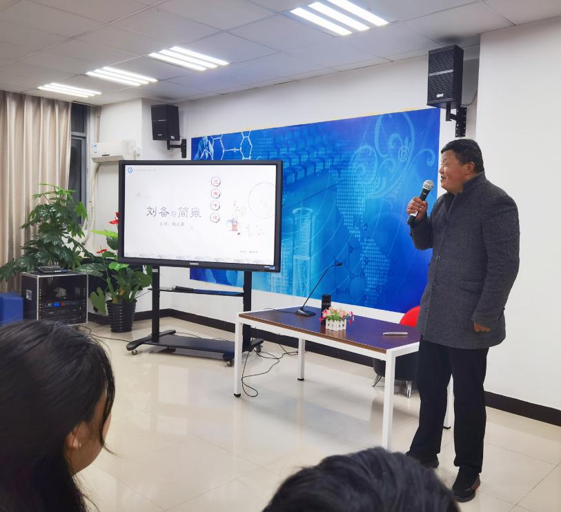 通过讲故事的方式,张元鼎老师梳理了刘备和卢植的师承关系,讲述了刘备上学、简雍逃学、刘备知错就改等趣事,用刘备少时壮志和奋斗历程教导学生从名著经典中汲取智慧,从善用智。随后,张老师与学生们进行了有奖猜谜的趣味互动,所设谜语皆为张老师自己创作。同学们踊跃参与,积极互动,讲座现场欢声笑语不断。